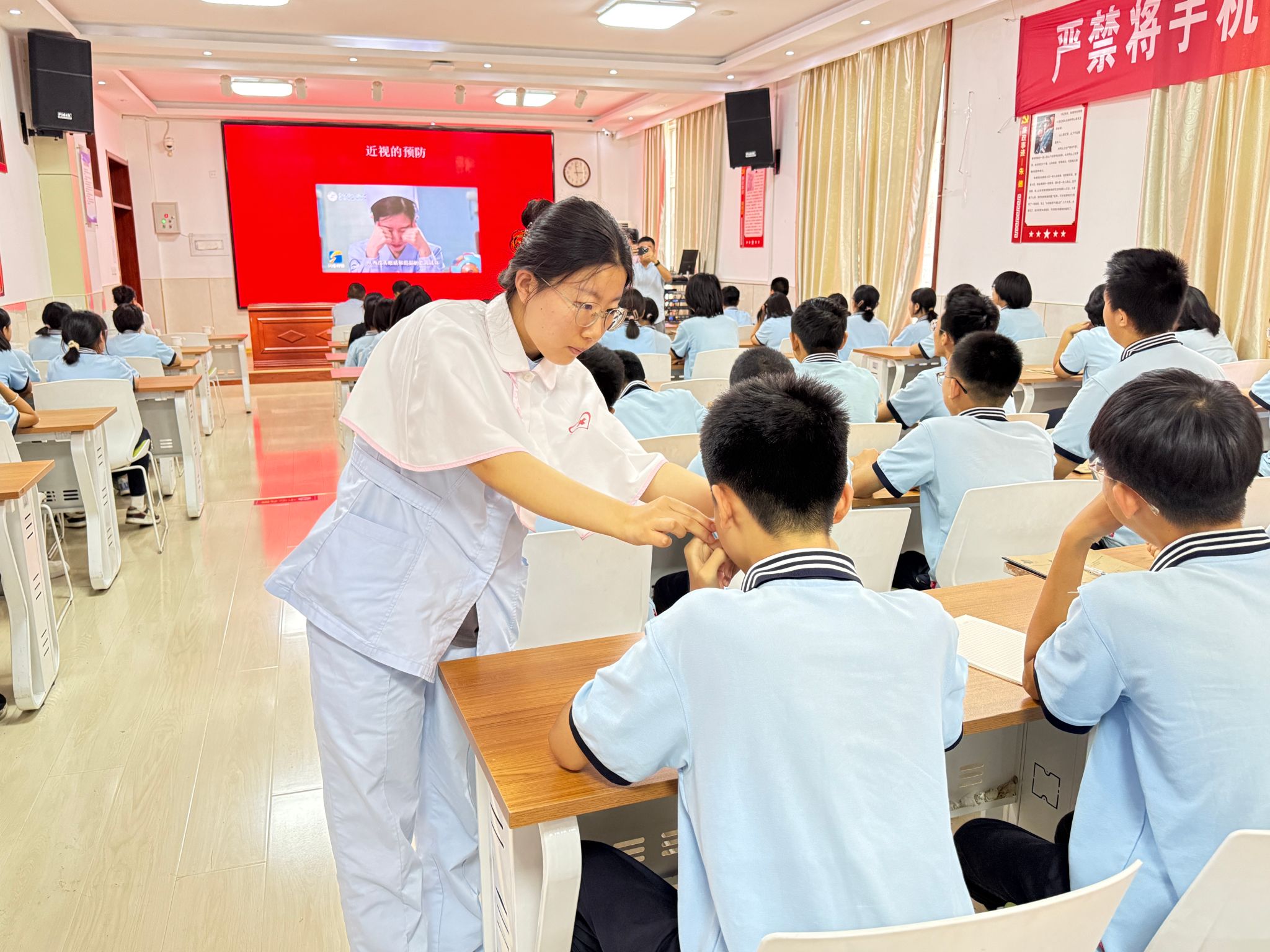 讲座结束后,本次活动进入了实践互动环节。两名经验丰富的志愿者走上讲台,耐心地指导学生们准确找到关键穴位,并为同学们详细讲解并示范正确的眼保健操动作。在志愿者的带领下,全体学生兴致勃勃地跟着练习起来。期间,志愿者走到学生中间,进行一对一指导,耐心纠正每个动作,确保每位同学都能掌握正确的按摩手法。现场学习氛围浓厚,同学们在轻松愉快的互动中既学到了护眼知识,又掌握了缓解眼疲劳的有效方法。