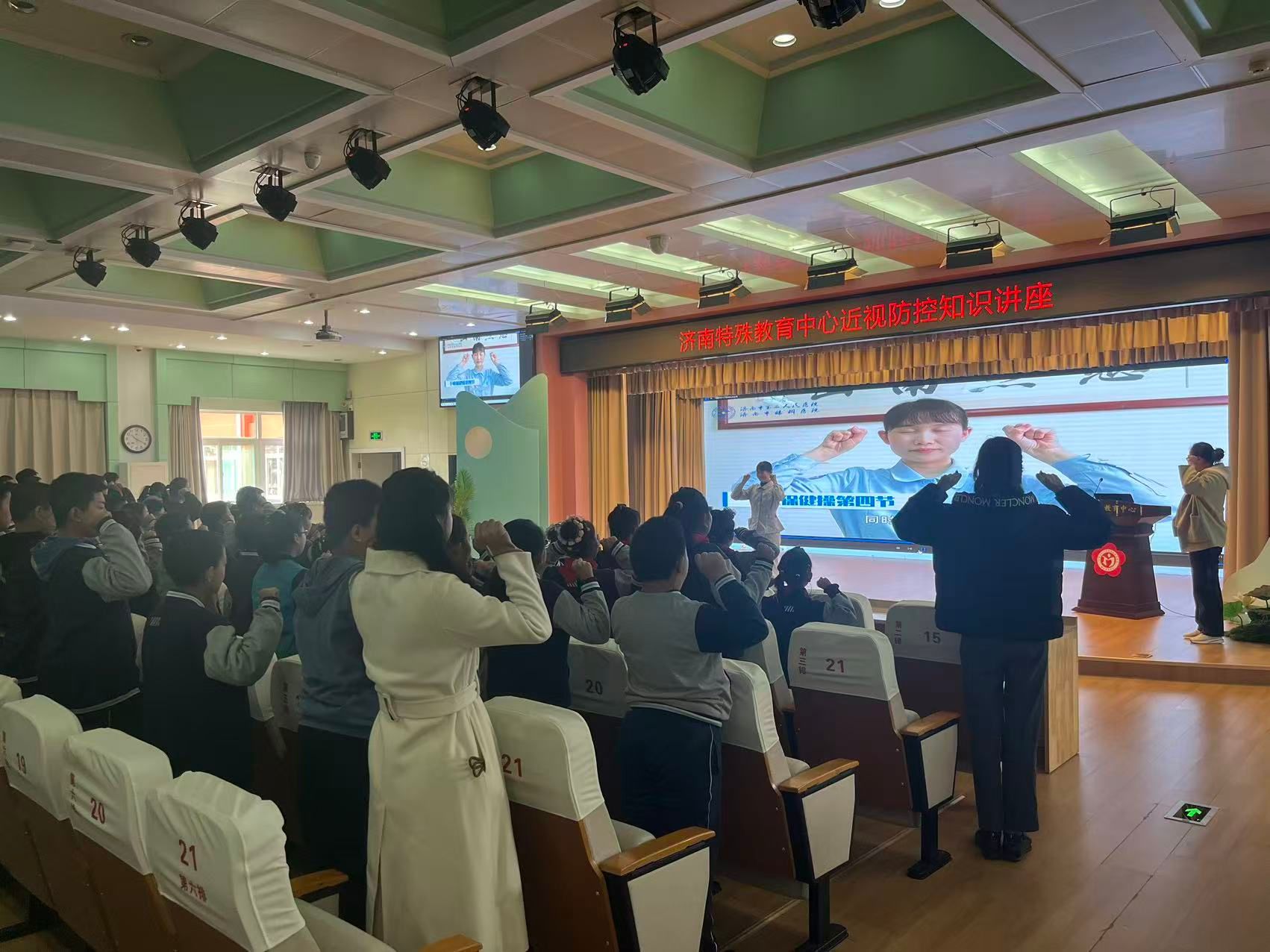 活动当天,眼五科(斜弱视与儿童眼病专业)副主任医师尹晓琳为特教中心的师生们带来了一场生动实用的近视防控知识讲座。她用通俗易懂的语言,结合特殊儿童的学习与生活特点,详细讲解了近视的成因、预防措施及日常护眼要点,引导师生们树立正确的眼健康观念。讲座现场互动积极,气氛热烈。讲座结束后,医院志愿者登上讲台,现场教授干眼操和眼保健操。志愿者动作规范、讲解细致,将护眼知识与实操训练有机结合,帮助孩子们掌握科学、实用的眼部放松方法。老师和孩子们一起在志愿者的耐心指导下认真练习,现场洋溢着轻松愉快的学习氛围。