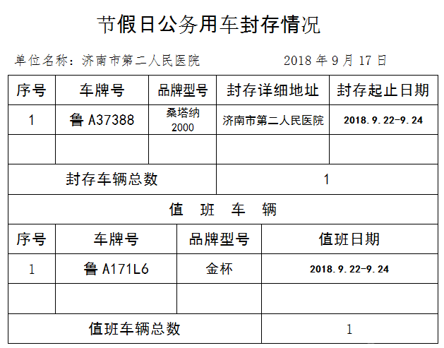 市二院2018年中秋节公务用车封存情况