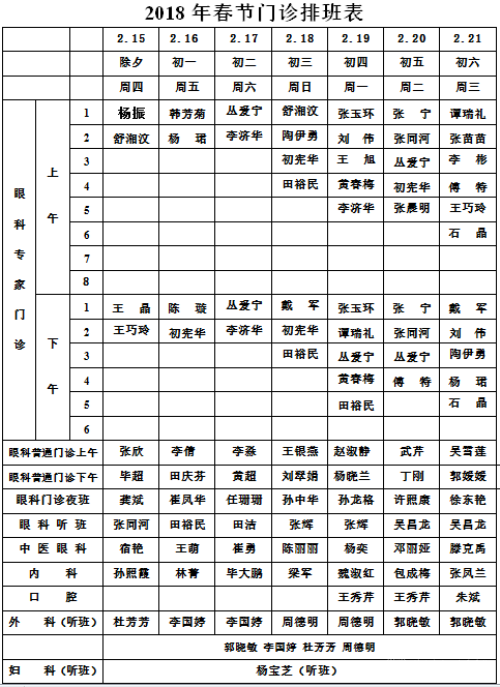 2018年春节门诊排班表